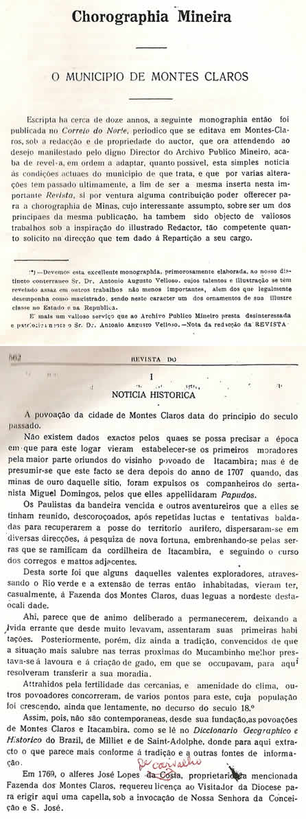 | Transcrição da Revista do Archivo Público Mineiro, editada em ouro Preto, então capital de Minas, em 1897. O conteúdo, doze anos antes, em 1885, saiu no primeiro jornal de Montes Claros, “Correio do Norte”, fundado e editado pelo autor – o depois desembargador Antônio Augusto Veloso, pai da imprensa de Montes Claros. É o mais antigo documento sobre a história de Montes Claros - Parte 1 A mais antiga notícia em formato acadêmico que se tem de Montes Claros foi divulgada na capital Ouro Preto pela Revista do Archivo Público Mineiro, em outubro e dezembro de 1897. Doze anos antes, havia sido publicada em M. Claros, pelo jornal Correio do Norte, "de propriedade do autor". É um documento raro hoje em dia, saído da pena do depois desembargador Dr. Antônio Augusto Veloso, reconhecido e homenageado como o pai da imprensa de Montes Claros. Recebeu o nome de "Chorographia Mineira - O Município de Montes Claros". A remota publicação do Archivo Público diz, na apresentação, sob a "direcção e redacção de José Pedro Xavier da Veiga, diretor do mesmo Archivo": "Devemos esta excellente monographia, primorosamente elaborada, ao nosso distincto conterrâneo Sr. Dr. Antonio Augusto Velloso, cujos talentos e ilustração se têm revelado assaz em outros trabalhos não menos importantes, além dos que legamente desepenha como magistrado, sendo neste caracter um dos ornamentos de sua illustre classe no Estado e da República. É mais um valioso serviço que ao Archivo Público Mineiro presta desinteressada e patrioticamente o Sr. Dr. Antônio Augusto Velloso". É com este mesmo espírito que o montesclaros.com passa a reproduzir, a partir de hoje, em versão eletrônica na forma de folhetim, esta primeira e benemérita notícia da história de Montes Claros, acreditando que suscitar o registro dos passos inaugurais da civilização que aqui surgiu contribuirá, e muito, para entender e comprender a formulação do "ajuntamento novo" que avança pelo tempo. É, ainda, canhestra homenagem ao autor e sua descendência, pelo pioneiro serviço que prestou às gerações seguintes, ao iluminar os nossos primeiros passos. Que avançam para comemorar os iniciais 300 anos, talvez até completados, pois aqui se revela que os primeiros moradores chegaram por volta de 1707 às margens do hoje quase desaparecido rio Vieira. ![]() (Continuará, nos próximos dias, até a publicação de toda a "Chorografia") |